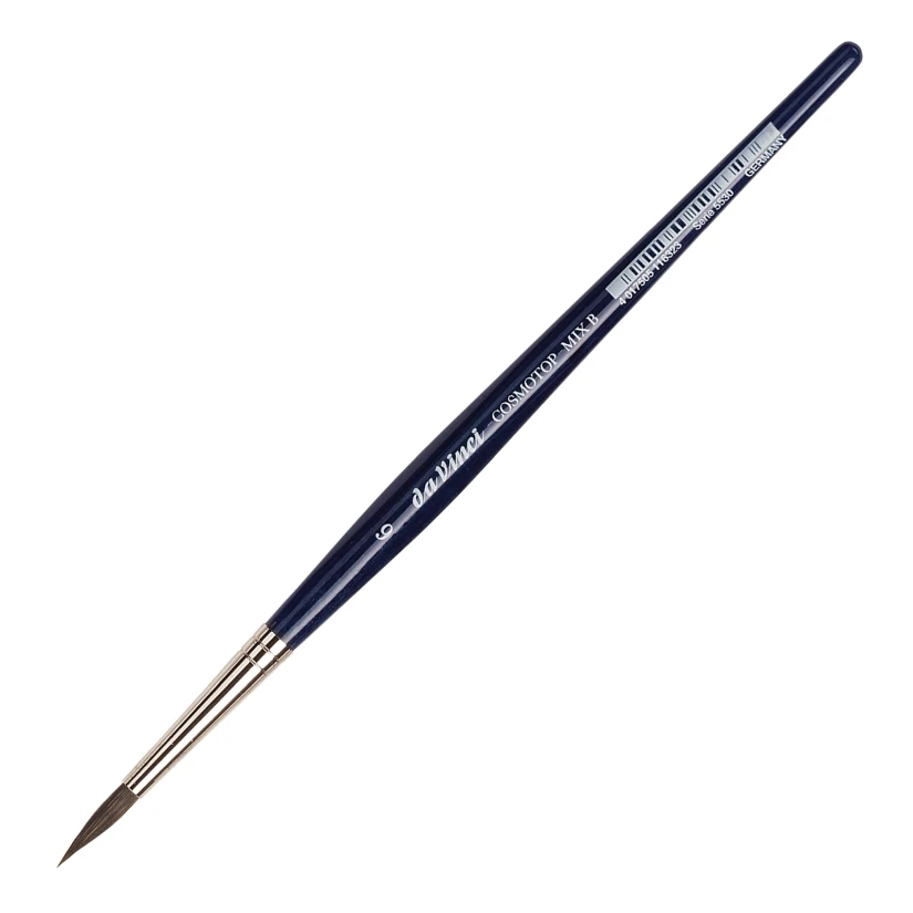 Najwyższej jakości pędzel akwarelowy Da Vinci wyprodukowany z kompozycji klasycznego, naturalnego włosia Kolinsky, rosyjskiej niebieskiej wiewiórki oraz czarnego sobola z minimalną domieszką syntetycznych włókien. Włosie zostało ułożone bezszwowo w srebrnej skuwce. Pędzel posiada lakierowany trzonek dodatkowo uformowany w miejscu trzymania dla zwiększenia wygody oraz pewności chwytu.
