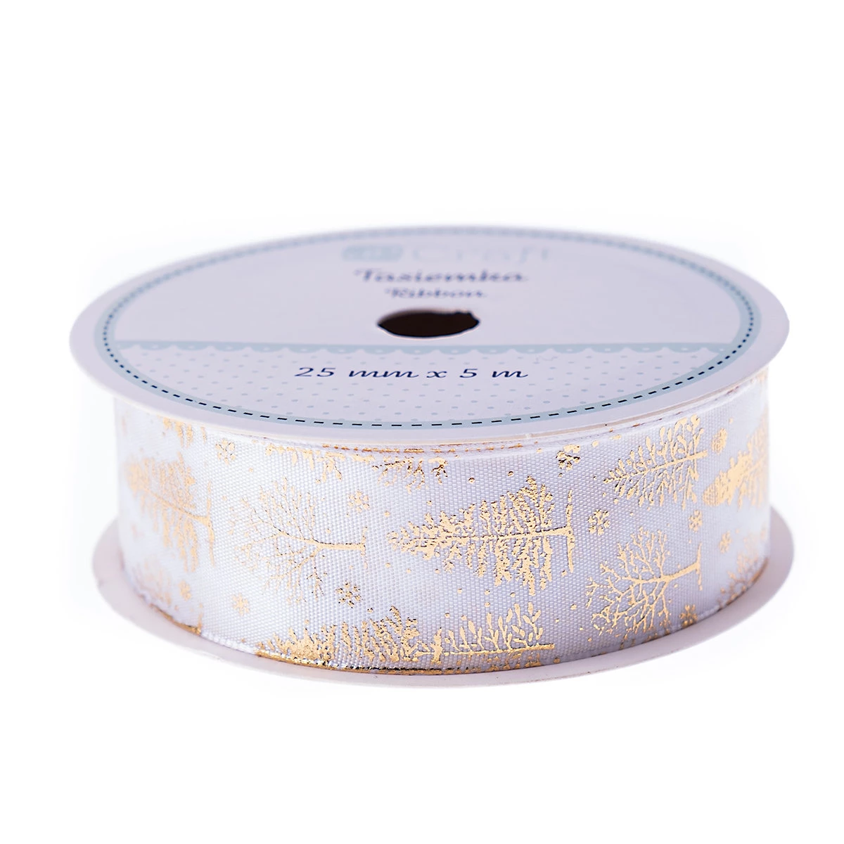 DP CRAFT TASIEMKA 25mm x 5m WHITE CHRISTMAS CHOINKI