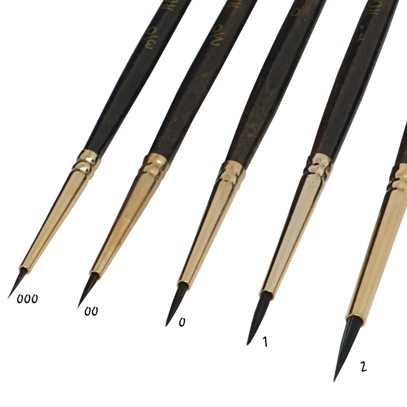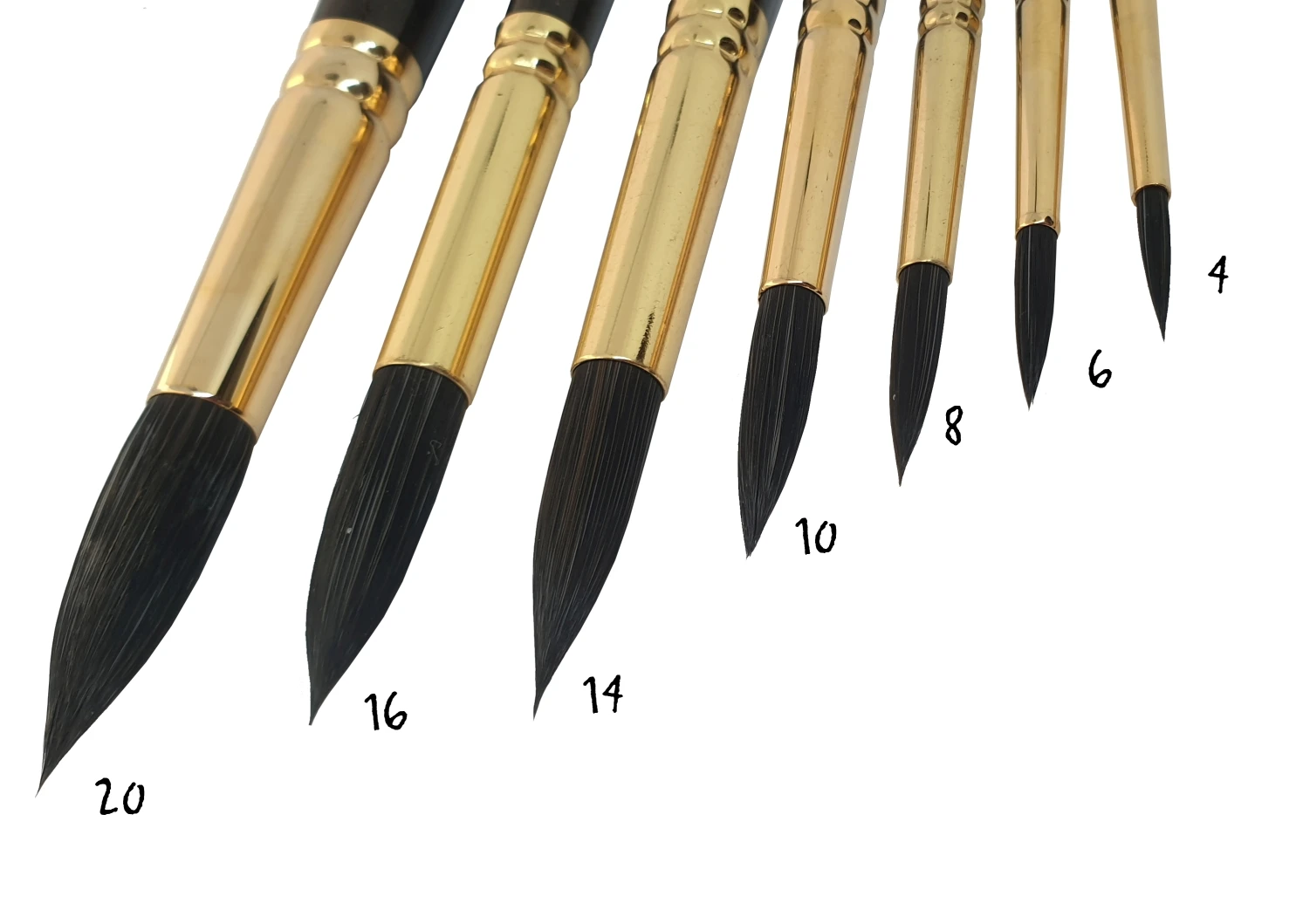 Pędzle akwarelowe okrągłe – seria „Synthetic Squirrel Round” Wykonane z miękkiego, sprężystego włosia syntetycznego imitującego włosie wiewiórki, osadzone na krótkiej rączce drewniej, lakierowanej transparentnie na brązowo, skuwka wykonana z mosiądzu, pozłacana.