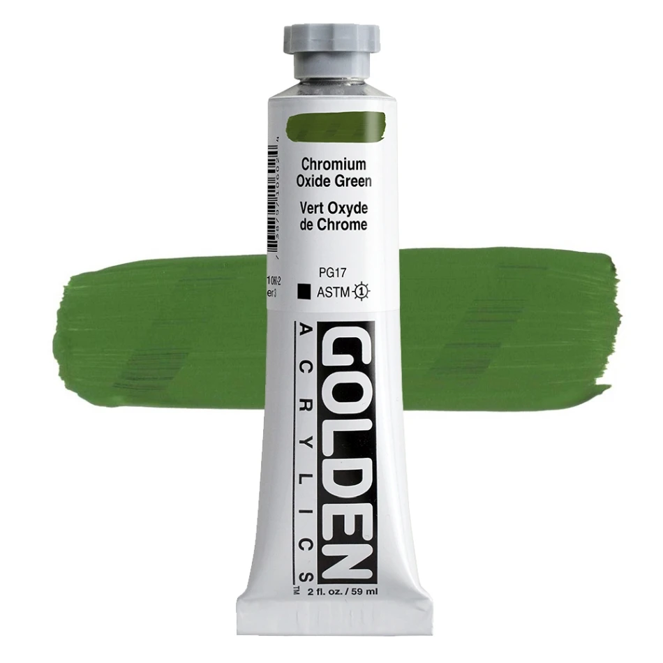 Golden Heavy Body Acrylics: 1060 Chromium Oxide Green 59ml - Pigmenty: PG17 (77288) - Przezroczystość / Krycie: Kryjąca - Wartości CIE lab: L*44.19 a*-15.5 b*16.04 - Klasa światłoczułości: Znakomita - Seria: 3 Oryginalna linia akryli GOLDEN jest znana z wyjątkowo gładkiej, gęstej, maślanej konsystencji. Zawiera największy asortyment unikalnych czystych pigmentów w 100% akrylowej emulsji dostępnej dla profesjonalnych artystów. Kolory te oferują doskonałą trwałość i odporność na światło. Nie zawierają wypełniaczy, tonerów ani barwników. Każdy kolor Heavy Body ma inną formułę w zależności od rodzaju pigmentu. Kolory, które tolerują większe „ładunki” pigmentu, wysychają do bardziej nieprzezroczystego, matowego wykończenia. Kolory, które są bardziej reaktywne i nie akceptują wysokiego obciążenia pigmentem, schną do błyszczącego wykończenia i mają tendencję do bycia bardziej przezroczystymi. Kolory Heavy Body nie zawierają żadnych dodatków, takich jak środki matujące, dlatego połysk każdego koloru będzie inny.