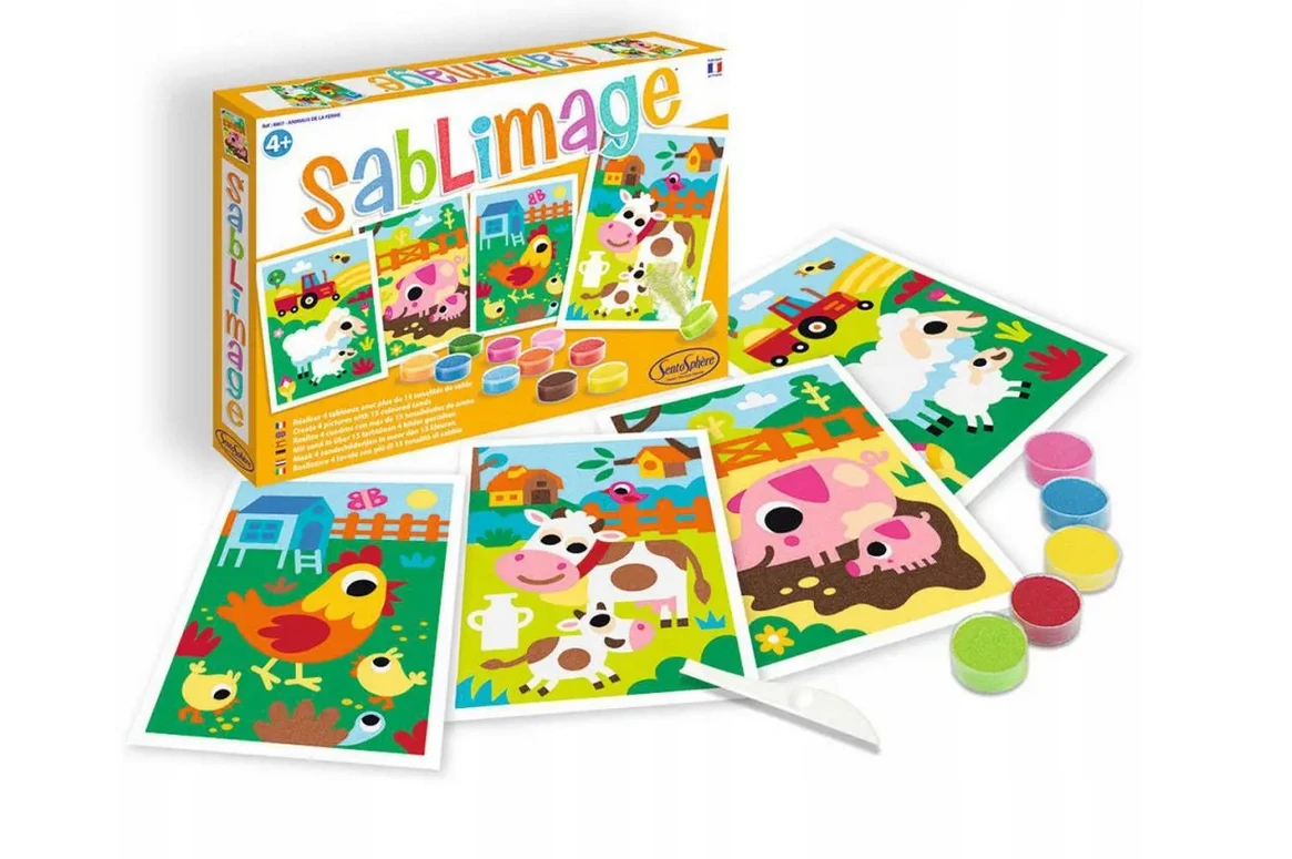 Zestaw Farma 4 obrazki piaskowe Sablimage marki SentoSphere pozwala dzieciom tworzyć urocze obrazki z wizerunkami zwierząt przy użyciu kolorowego piasku. Dziecko odkłada odpowiedni element, wysypuje piasek i krok po kroku tworzy własne małe dzieło sztuki, rozwijając przy tym kreatywność i zdolności manualne.