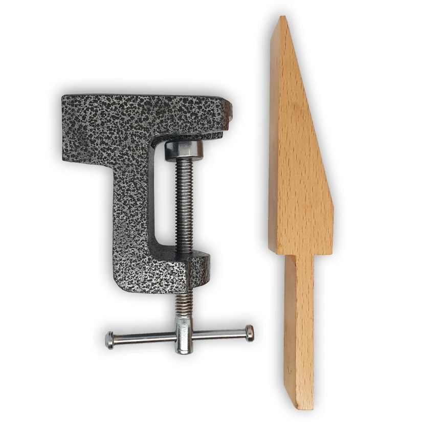 Fajnagiel z kowadełkiem, znany również jako drewniany klin z imadłem do stołu jubilerskiego. To podstawowe, wielofunkcyjne narzędzie w pracowniach jubilerskich i złotniczych.