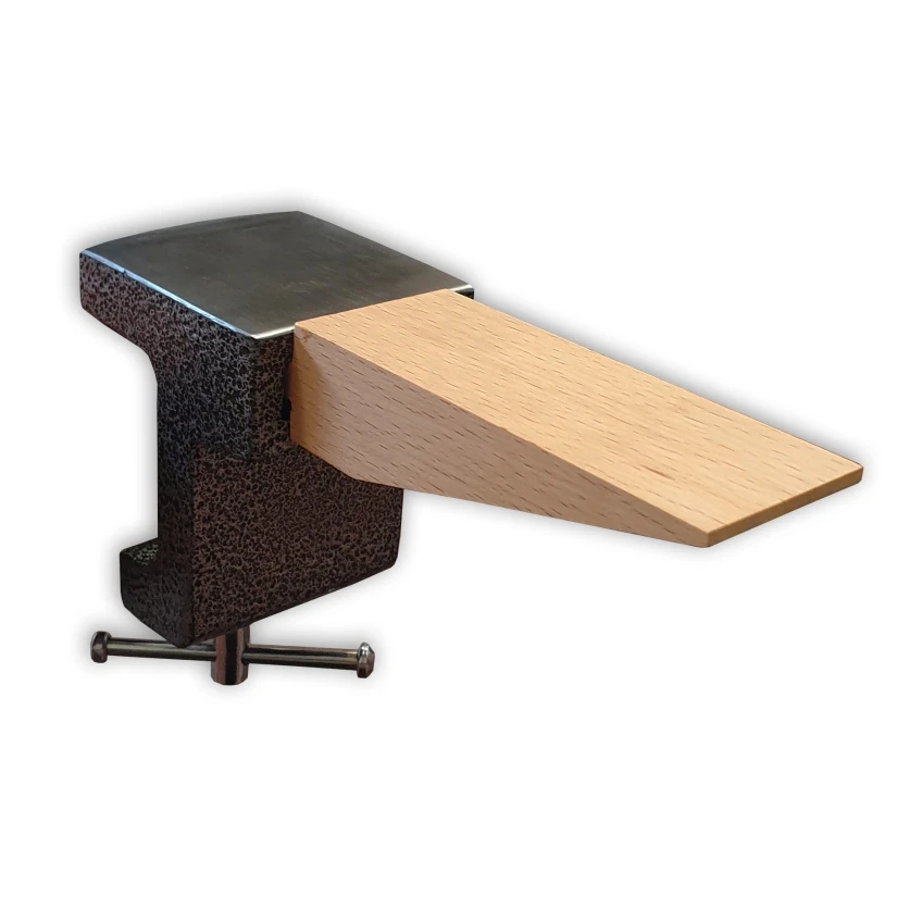 Drewniany klin: Jest to długa, drewniana deska o klinowym kształcie, zwężająca się ku końcowi. Zazwyczaj wykonana jest z twardego drewna, takiego jak buk, co zapewnia trwałość, a jednocześnie jest delikatne dla obrabianych metali.