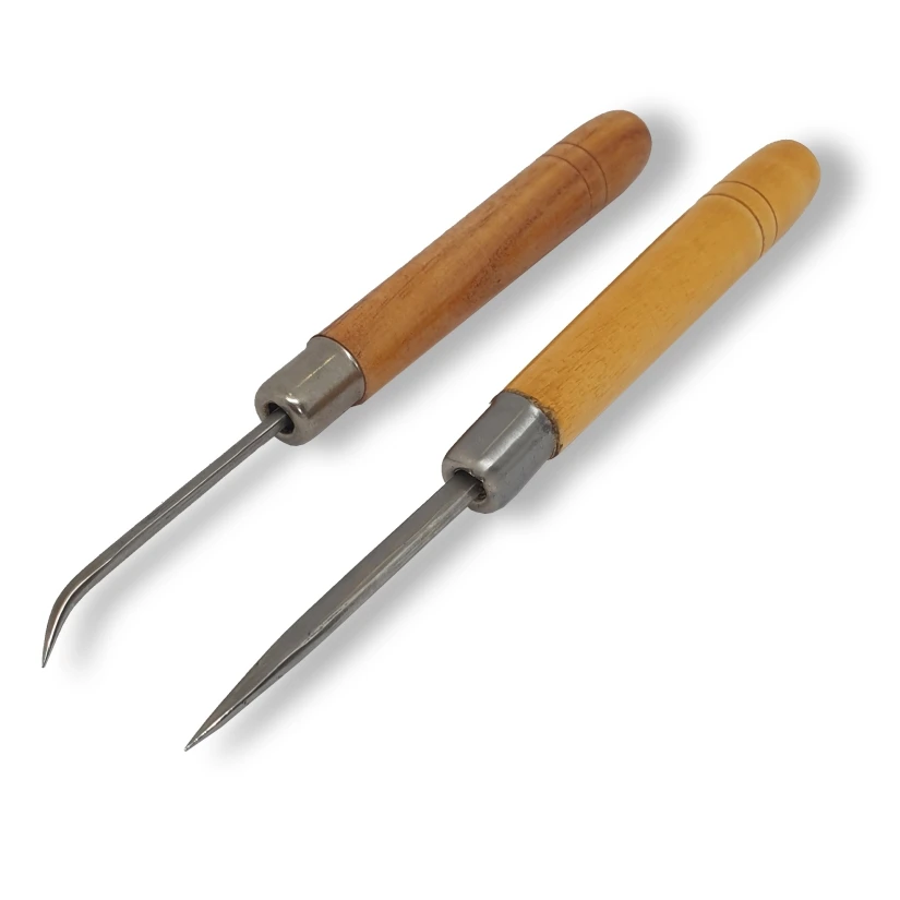 Narzędzia te mają drewnianą rękojeść i stalową końcówkę. Jak widać na zdjęciu, końcówki mogą mieć różne kształty, np. prosty, ostry szpic lub zakrzywiony hak. Różnorodność końcówek umożliwia precyzyjne dotarcie do trudno dostępnych miejsc, tworzenie rowków czy modelowanie detali.
