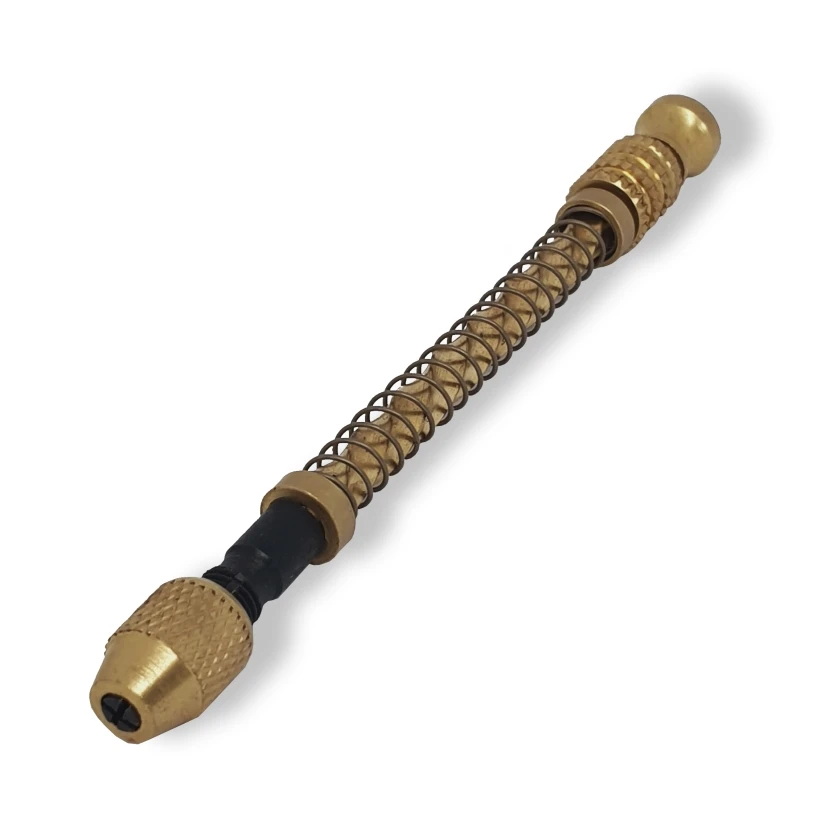 Narzędzie to składa się z mosiężnego korpusu z wbudowaną sprężyną. Służy do precyzyjnego wiercenia małych otworów w metalu, drewnie lub innych miękkich materiałach. Działa na zasadzie nacisku i obrotów, co pozwala na bardzo delikatną i kontrolowaną pracę, a sprężyna pomaga w utrzymaniu równomiernego ruchu. To idealne narzędzie do małych prac w jubilerstwie.