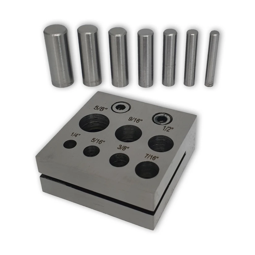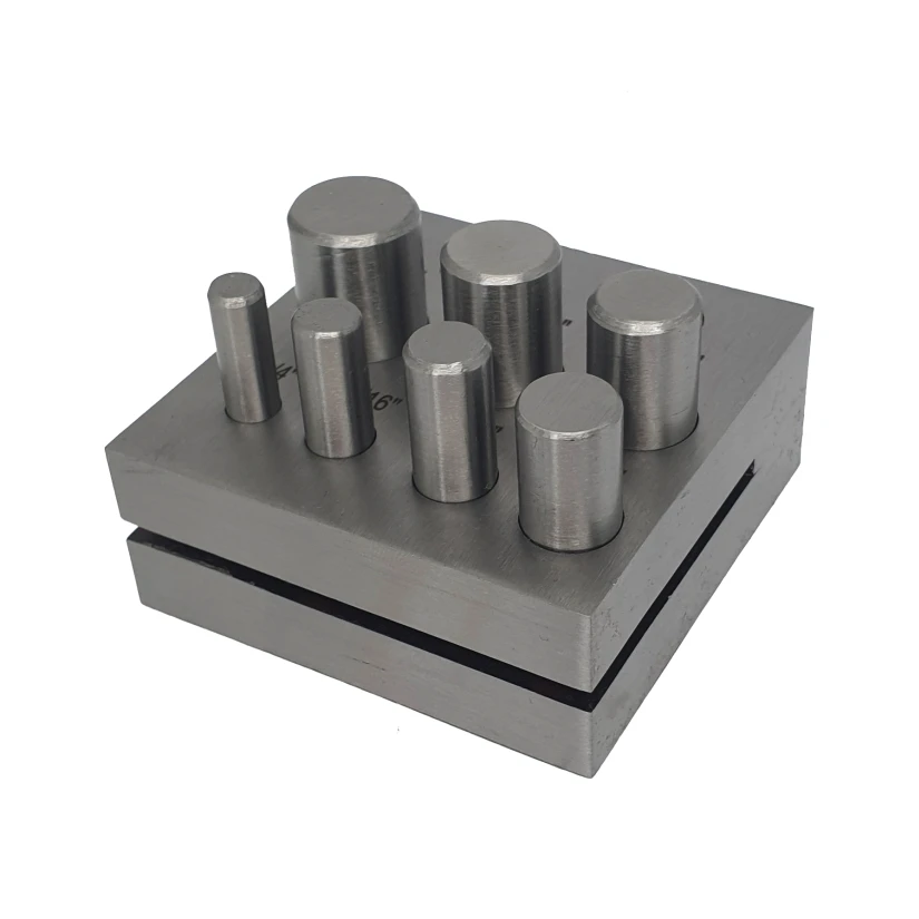 Stemple (wykrojniki): Do zestawu dołączone są stemple, czyli metalowe pręty o różnych średnicach. Ich końcówki są precyzyjnie wykonane, aby idealnie pasowały do otworów w podstawie.
