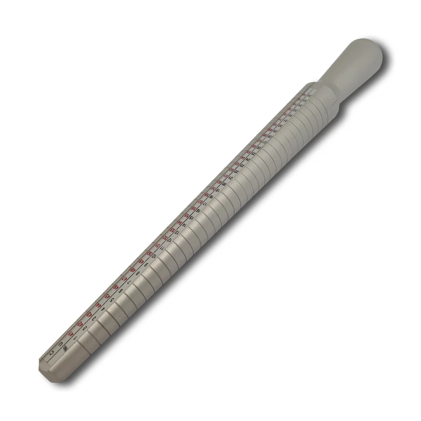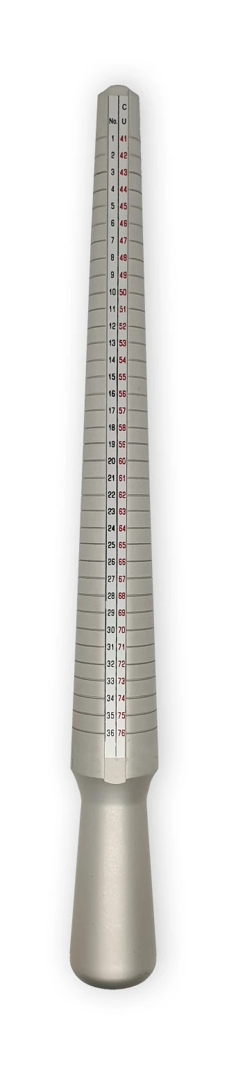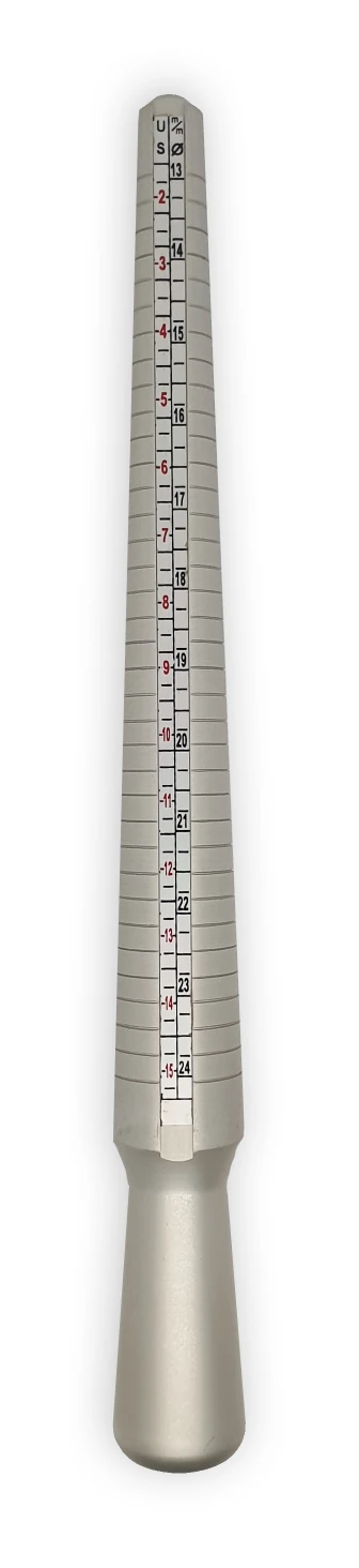 Pomiar rozmiaru pierścionka: Wystarczy wsunąć pierścionek na stożek, a numer na skali w miejscu, w którym się zatrzyma, wskaże jego rozmiar.