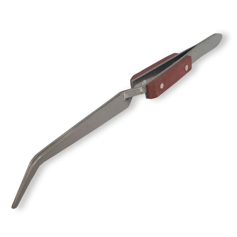 Kształt: Pęseta ma zagięte, smukłe końcówki, które umożliwiają precyzyjny chwyt i dotarcie do trudno dostępnych miejsc.