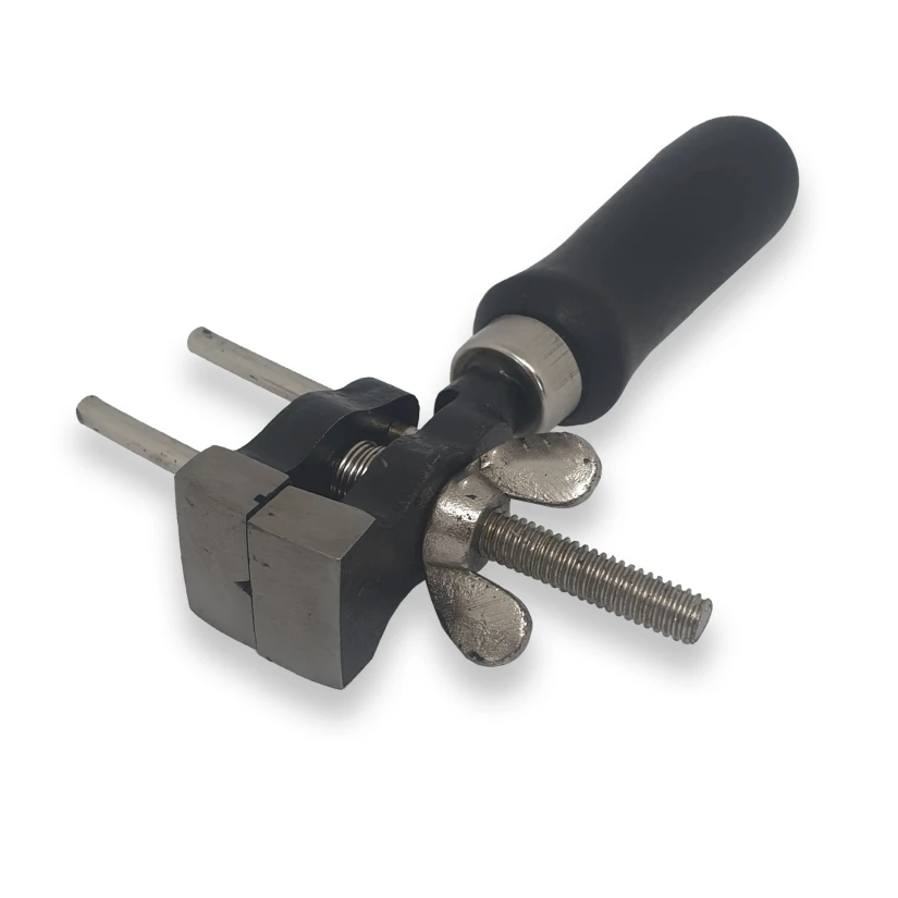 Śruba zaciskowa: Długa śruba z nakrętką motylkową, która pozwala na łatwe i szybkie regulowanie rozstawu szczęk oraz ich zaciskanie.