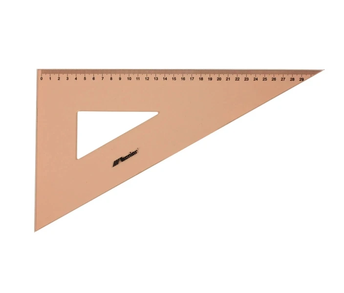 To plastikowy trójkąt kreślarski, przeznaczony do rysunków technicznych, geometrycznych oraz kreślenia linii pod kątem 60° (kąty: 30° / 60° / 90°). Dłuższa przyprostokątna ma 32 cm, co pozwala komfortowo pracować na średnich arkuszach papieru.