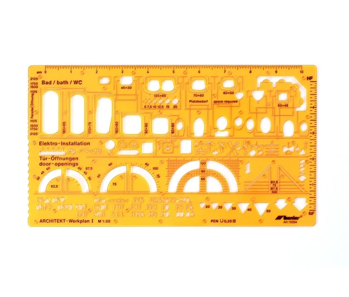 Na szablonie umieszczono zestaw praktycznych symboli technicznych, takich jak elementy sanitarne, instalacyjne, okna czy zakresy otwierania drzwi, co pozwala szybko i dokładnie odwzorowywać detale na projektach. Model współpracuje z ołówkami automatycznymi, cienkopisami i rapidografami, najlepiej o grubości linii około 0,35 mm.