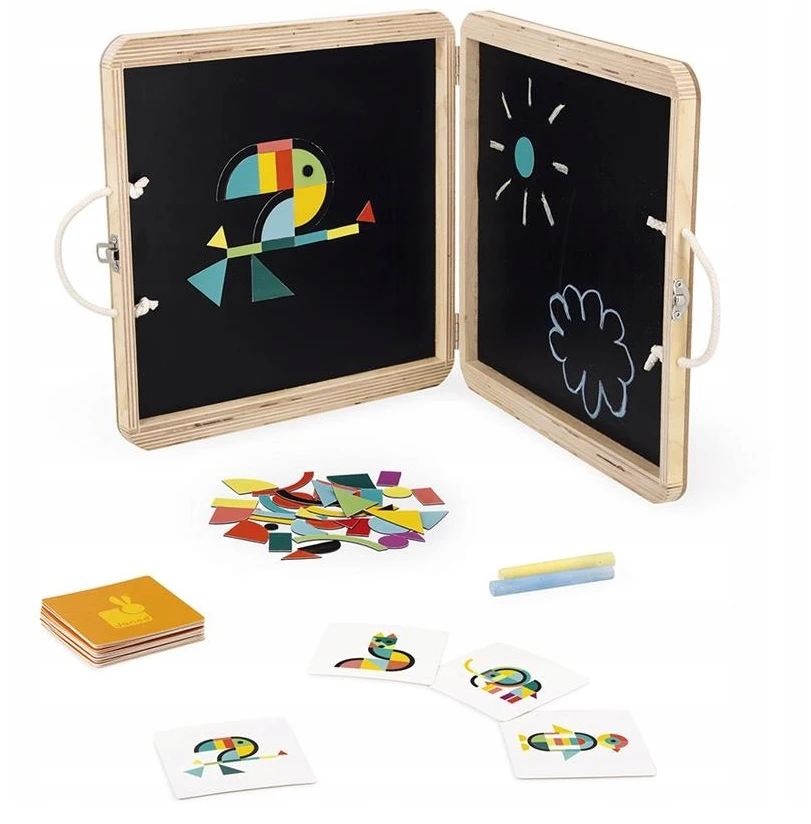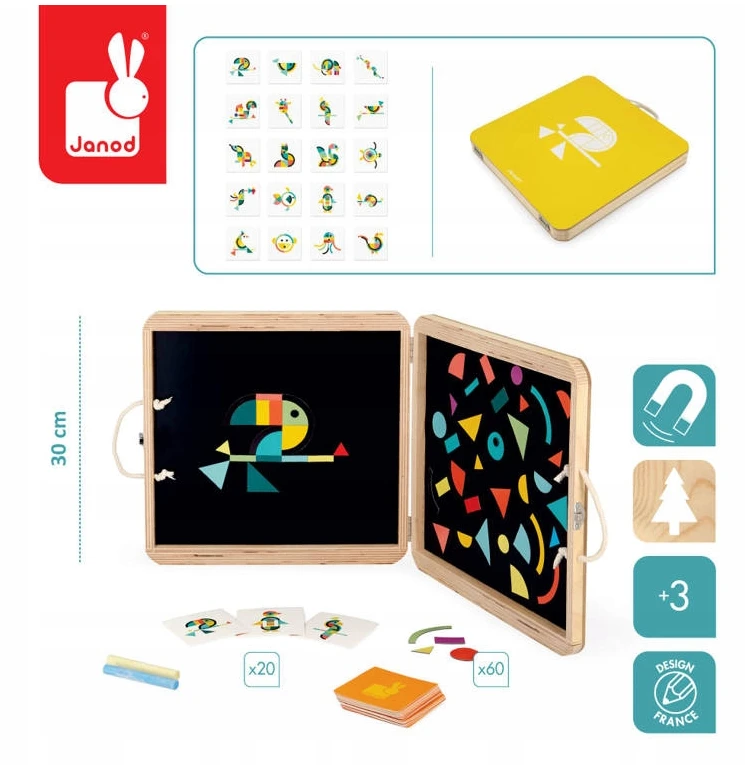 Elementy wykonane są z drewna z certyfikatem FSC oraz magnesu, a całość zapakowana jest w estetyczną, poręczną walizkę z wygodną rączką, która ułatwia przenoszenie i przechowywanie. W opakowaniu znajduje się 60 elementów oraz 20 kart z ilustracjami zwierząt do odtworzenia i kreda do rysowania. Zabawka przeznaczona jest dla dzieci od 3 roku życia, a jej wykonanie spełnia normy bezpieczeństwa EN71 oraz REACH. Design powstał we Francji i łączy funkcjonalność z atrakcyjnym wyglądem.