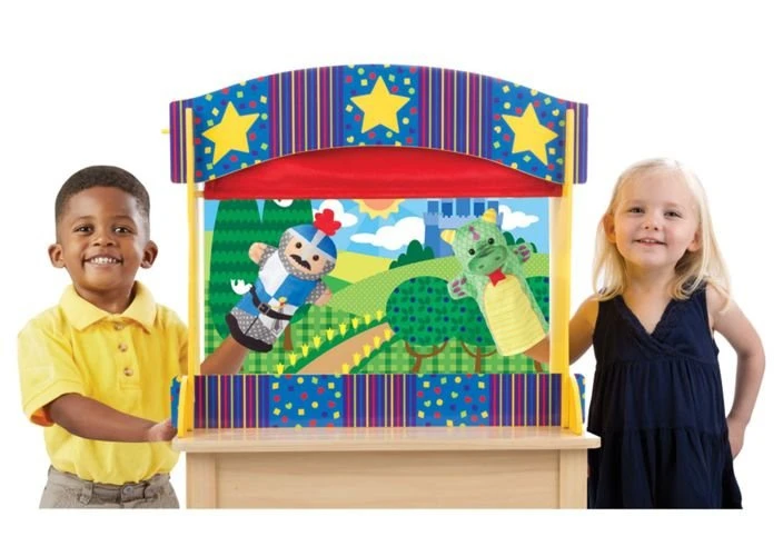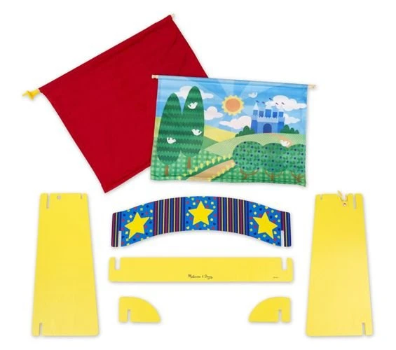 Stołowy teatrzyk kukiełkowy marki Melissa & Doug to piękna scena drewniana, stworzona do rozwijania kreatywności i narracyjnego myślenia u dzieci. Zasłonka welurowa podnosi się i opuszcza, a dwustronne tło pozwala zmieniać wygląd sceny — od zaczarowanego królestwa po wschód słońca. Konstrukcja składa się szybko, a po złożeniu może być przechowywana płasko, co oszczędza miejsce. Teatrzyk zaprojektowano tak, by był stabilny i bezpieczny podczas zabawy.