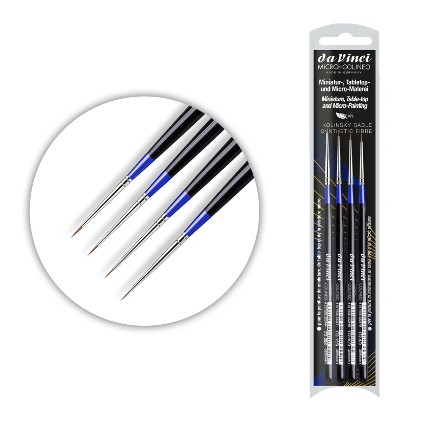 Zestaw Da Vinci Micro‑Colineo 4272 (EAN 4017505223182) zawiera cztery pędzle z serii 172 — rozmiary ‑20, ‑15, ‑10 i ‑5. Włosie syntetyczne „Colineo” zostało opracowane jako alternatywa dla tradycyjnego włosia kolinsky: łączy w sobie różne długości prostych oraz falowanych włókien, co gwarantuje ultradobraną końcówkę (fine tip), wysoką elastyczność oraz bardzo dobrą absorpcję farby. Krótki sześciokątny uchwyt zapewnia wygodny chwyt oraz uniemożliwia toczenie się pędzla po stole — co docenią artyści pracujący nad detalami. Zestaw jest idealny do malarstwa miniaturowego, figurek typu tabletop, ilustracji, gdzie wymagana jest ekstremalna precyzja. Dzięki wysokiej jakości wykonania produkt sprawdzi się zarówno w pracowni profesjonalisty, jak i ambitnego hobbysty.