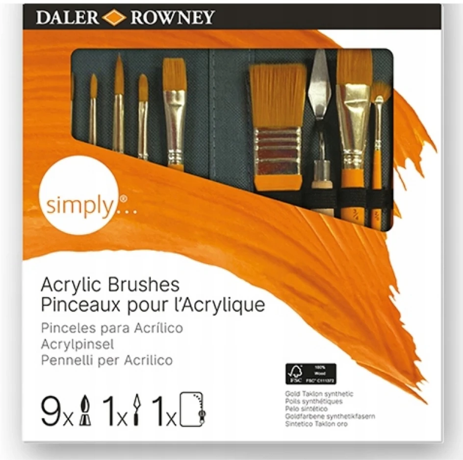 Komplet Acrylic Brushes Simply Daler Rowney to doskonały zestaw dla artystów, hobbystów i początkujących malarzy. Zawiera 9 wysokiej jakości syntetycznych pędzli o różnych kształtach oraz metalową szpachelkę malarską, zapakowane w praktyczne etui zamykane na zamek.