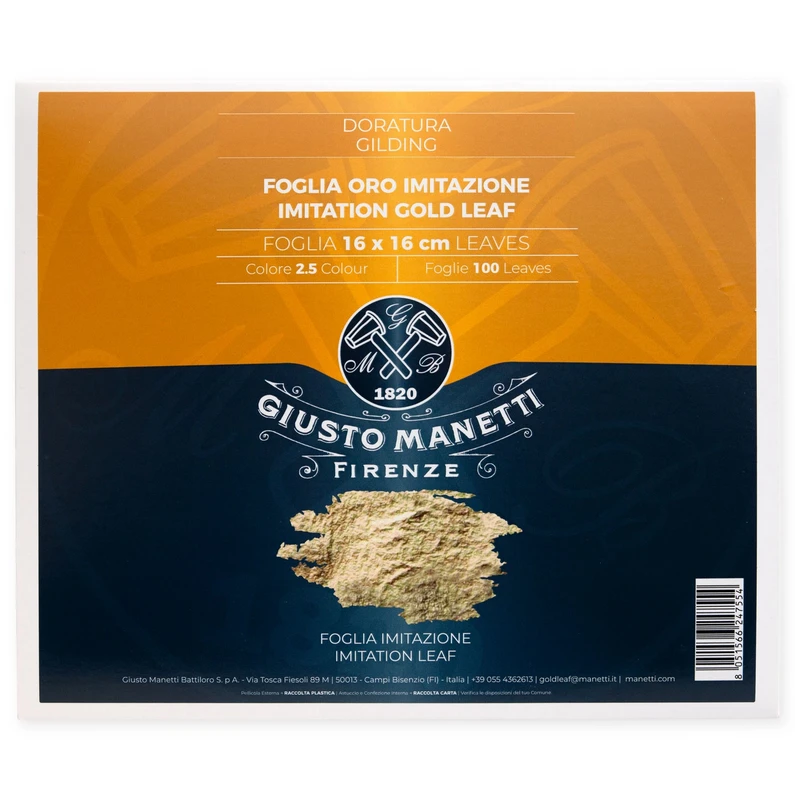 Płatki szlagmetalu są zapakowane w sztywną tekturową kopertę. W opakowaniu znajduje się 100 płatków 16x16cm bez przekładek. kolor nr 2,5 - "średni" kolor złota.