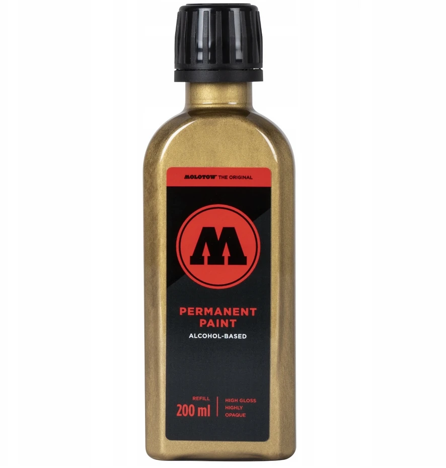 Molotow Permanent Paint Gold to uniwersalny tusz na bazie alkoholu, który zapewnia wysoką kryjącość i lekki połysk. Jest permanentny i szybkoschnący, co pozwala na zastosowanie zarówno wewnątrz, jak i na zewnątrz pomieszczeń. Tusz sprawdza się na wielu powierzchniach, takich jak metal, plastik, szkło, karton, papier i wiele innych.