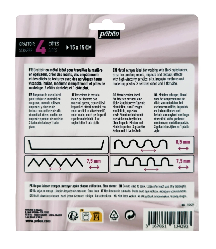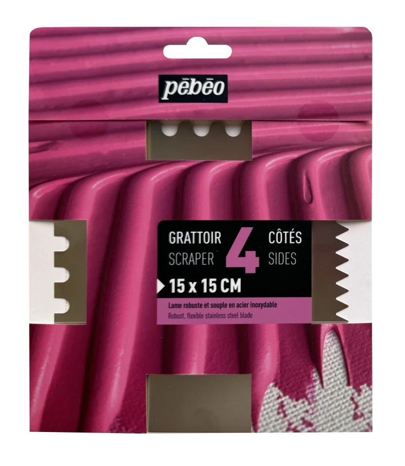 Szpachla malarska firmy PEBEO wykonana z metalu o czterech różnych krawędziach. Idealna do uzyskania efektów reliefowych czy impasto. Może być używana zarówno do farb akrylowych jak i olejnych czy past modelujących.