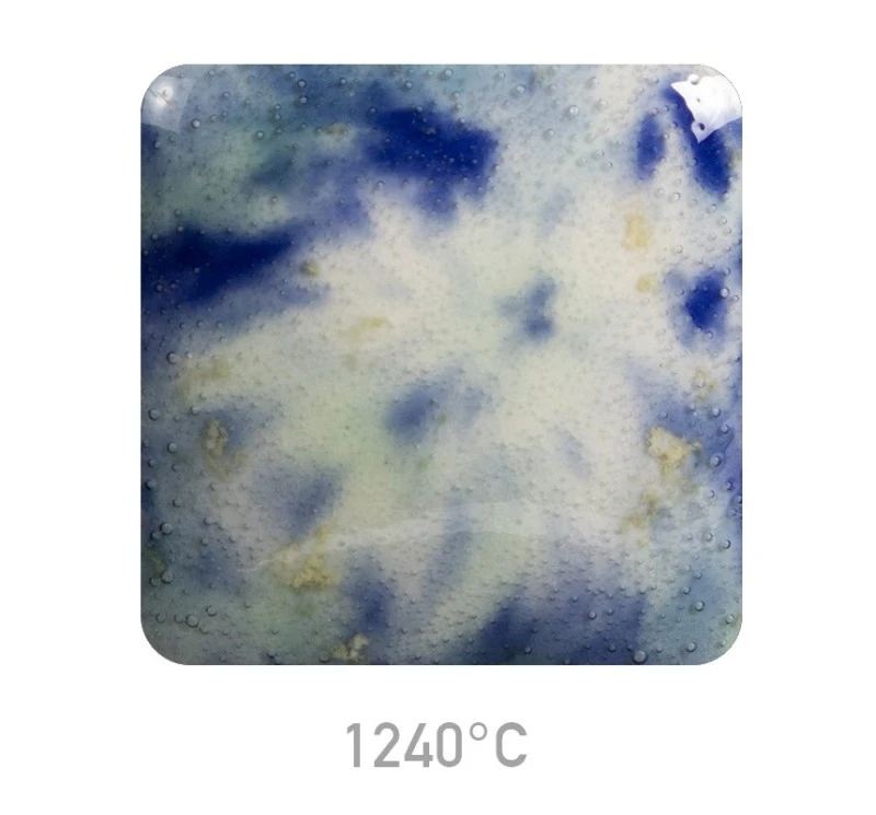 Wpływ Wyższej Temperatury (Wypał na 1222°C): Przy wyższych temperaturach szkliwo bazowe ma tendencję do blednięcia i stawania się bardziej transparentne, a kryształy silniej się roztapiają i zanikają, co zwiększa płynność całej glazury.