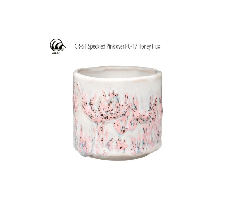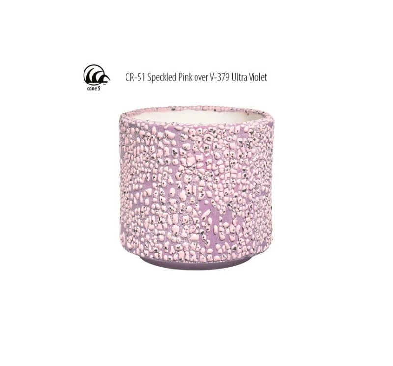 AMACO CR-51 Speckled Pink to błyszczące, jasno-różowe szkliwo z czarnymi plamkami, które po wypaleniu tworzy wypukłe kształty o różnych rozmiarach i formach. Crawls (pełzanie), to innowacyjna linia szkliw stworzona przez AMACO, która przekształca tradycyjną wadę szkliwienia – kurczenie się i pełzanie – w zamierzony, artystyczny efekt. Rezultatem jest dynamiczna, fakturowana powierzchnia.