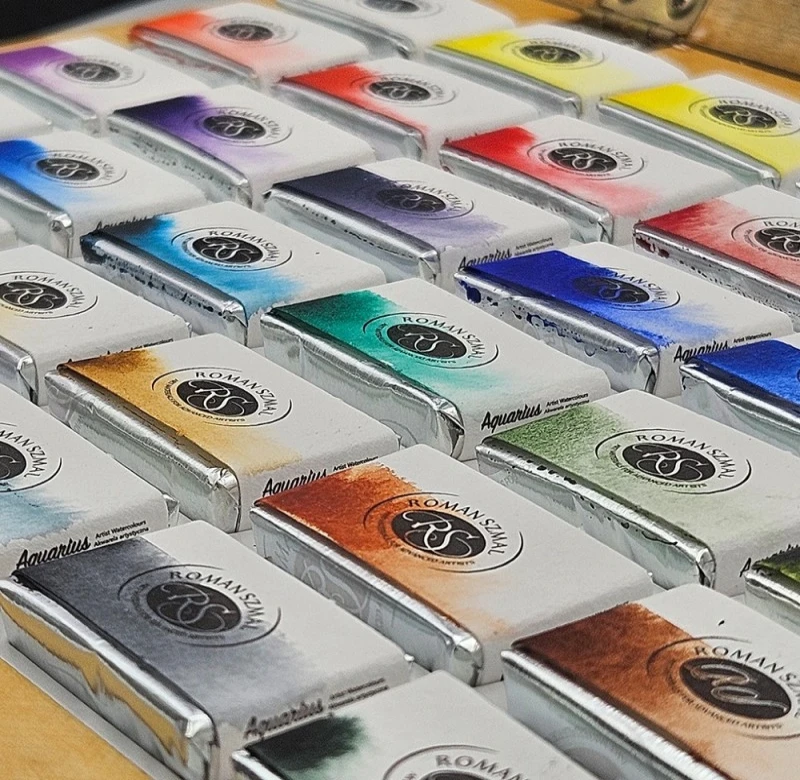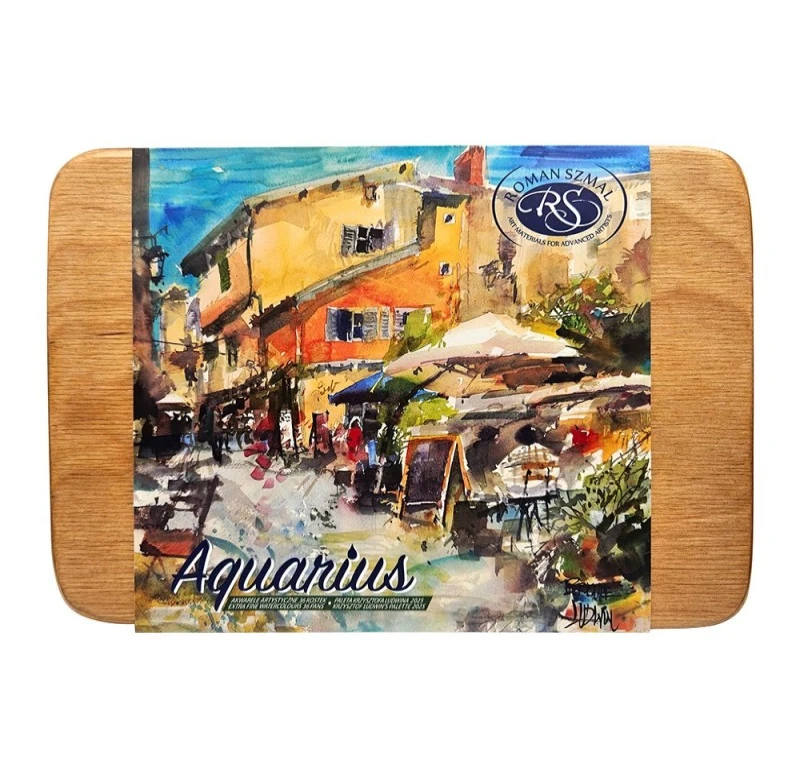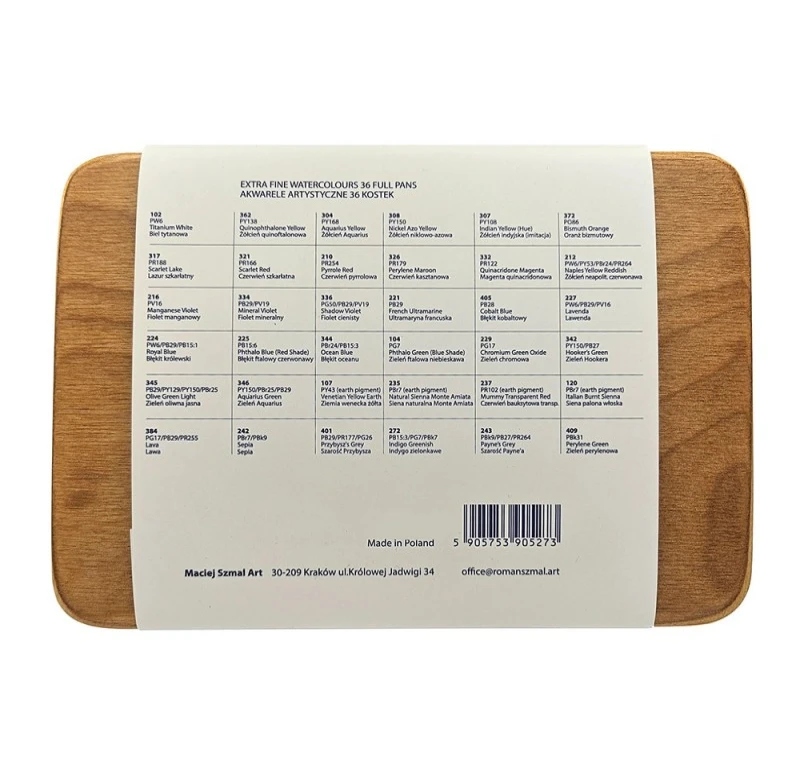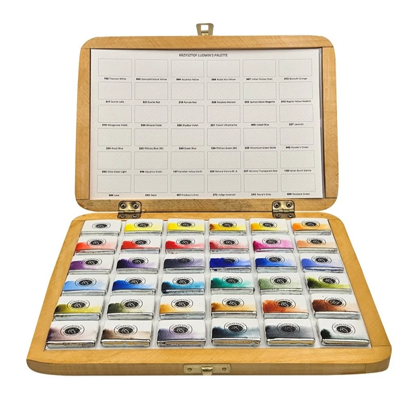 Drewniana kasetka zawiera 36 pełnych kostek akwareli, których wybór został opracowany przez polskiego akwarelistę Krzysztofa Ludwina. W zestawie znajduje się plastikowa paletka do mieszania kolorów oraz papierowy wzornik do samodzielnego malowania. Zestaw obejmuje nie tylko podstawowe barwy, takie jak żółcienie, błękity i róże, ale także farby z pigmentów rozwarstwiających się i strukturalnych, które pozwalają uzyskać unikalne efekty niemożliwe do osiągnięcia przy użyciu samych kolorów podstawowych. Dodatkowo, w kasetce znajdują się kolory powstałe z połączenia kilku pigmentów, które również zachowują efekt rozwarstwiania się. Drewniana kasetka została wykonana ręcznie przez rzemieślnika z wysokiej jakości drewna liściastego i trzykrotnie polakierowana lakierem o podwyższonej wodoodporności, co gwarantuje trwałość i elegancki wygląd. Akwarele dostępne są także na sztuki, co pozwala uzupełniać zestaw według własnych potrzeb.