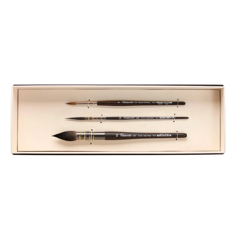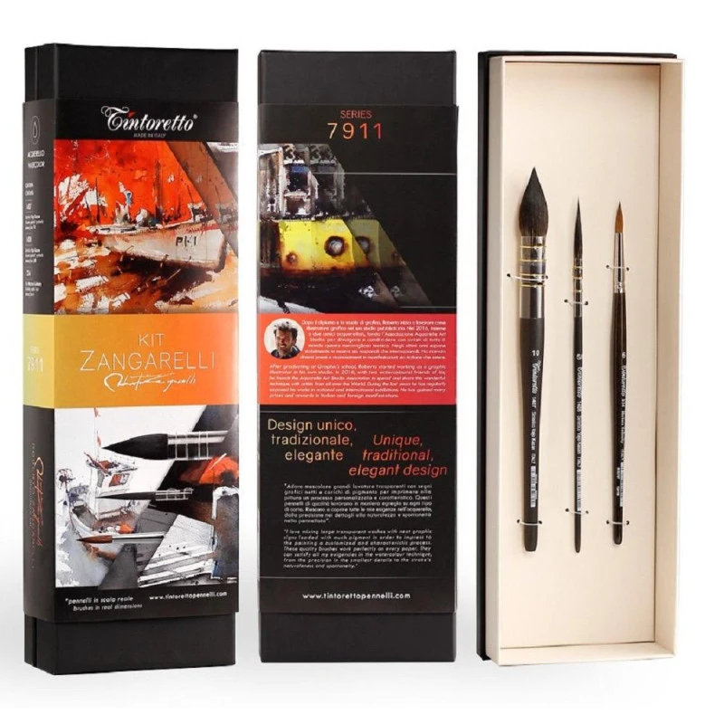Zestaw Tintoretto Serie ZANGARELLI 7911 to komplet trzech pędzli do akwareli z krótkim trzonkiem w eleganckim pudełku kartonowym Zestaw obejmuje tradycyjny pędzel okrągły z włosia syntetycznego imitującego Vajo Kazan Serie 1407 nr 10, tradycyjny pędzel okrągły z włosia syntetycznego imitującego Vajo Kazan Serie 1408 nr 5/0 oraz pędzel okrągły z włosia sobola Kolinsky Serie 334 nr 6