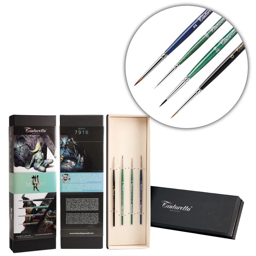 Cztery różne pędzle wybrane przez mistrza miniatur Massimiliano Richiero, znanego jako Maxart.