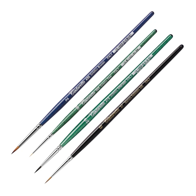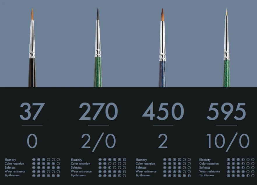 Seria 595, rozmiar 10/0: moim zdaniem najlepszy w całej gamie do malowania nawet najmniejszych detali. Najczęściej używam go do małych tekstur i drobnych szczegółów, takich jak oczy i końcowe rozświetlenia. Jeśli jest przechowywany prawidłowo, długo zachowuje swoją końcówkę, a jego miękkość pozwala używać go nawet do delikatnych odcieni.