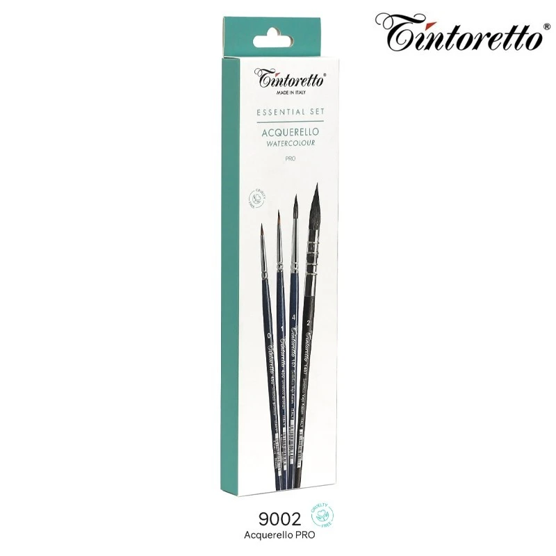 Zestaw Tintoretto Essential Akwarela PRO 9002 to komplet 4 pędzli z włosia syntetycznego przeznaczony do malarstwa akwarelowego, idealny do pracy nad detalem i precyzyjnym rozwinięciem kompozycji Pędzle zostały starannie dobrane, aby zapewnić płynność ruchu, kontrolę nad wodą i kolorem oraz możliwość tworzenia zarówno drobnych detali, jak i subtelnych przejść tonalnych