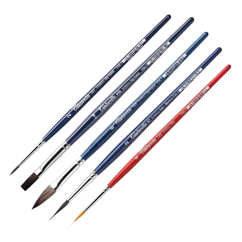 Seria 105, 107: Niesamowita syntetyczna imitacja włosia wiewiórki, nie tylko pod względem czysto estetycznym, ale przede wszystkim pod względem niekwestionowanej jakości włókien. Oprócz oryginalnych cech charakterystycznych dla włosia wiewiórki, takich jak miękkość i wyjątkowa kapilarność, posiada również doskonałą sprężystość końcówki, co sprawia, że syntetyczne włosie Kazan nie ma sobie równych we wszystkich technikach wymagających farb na bazie wody, w tym również w dekoracji ceramicznej.