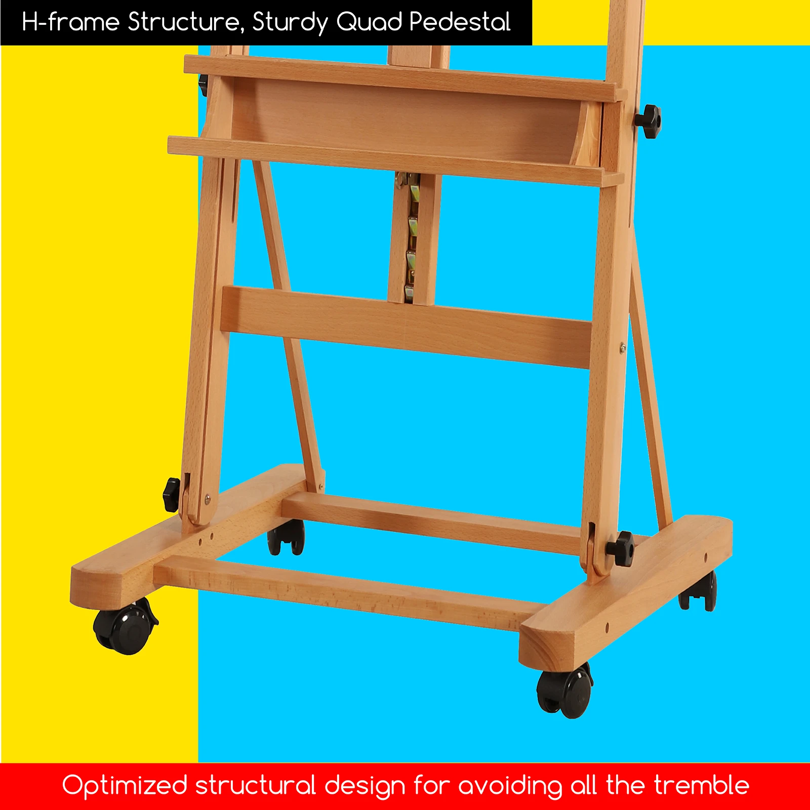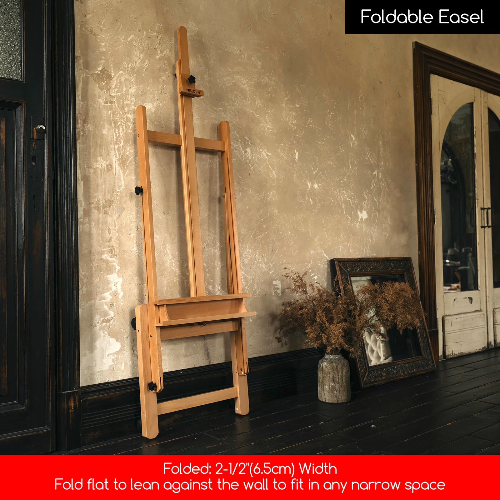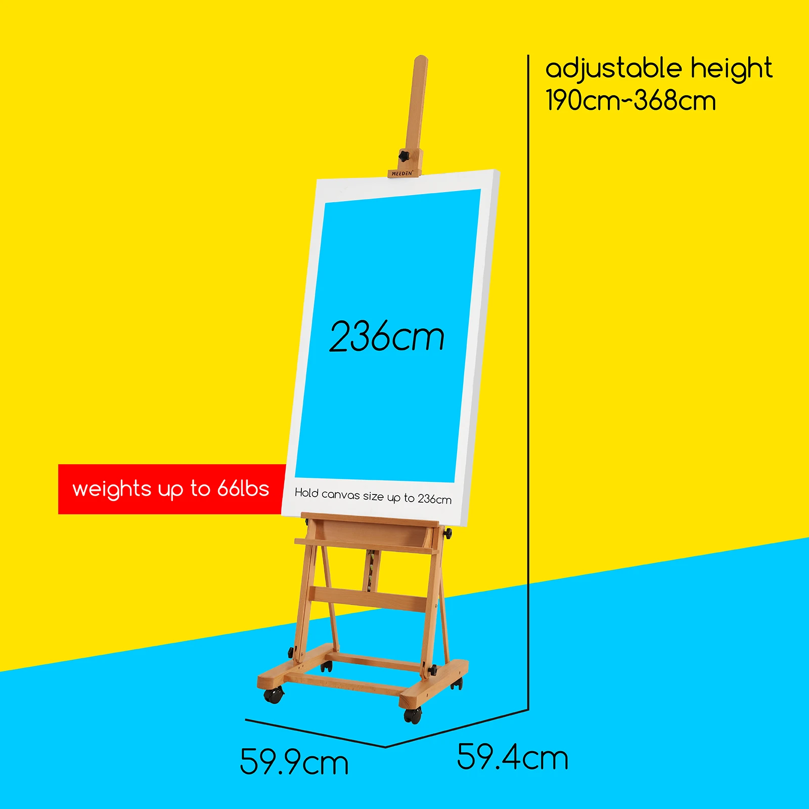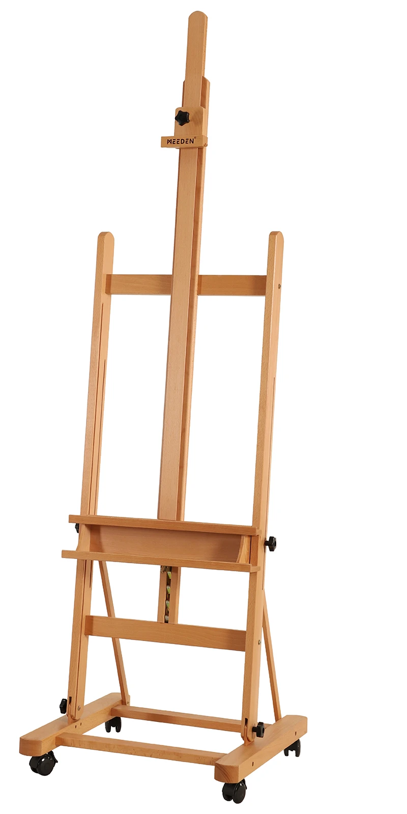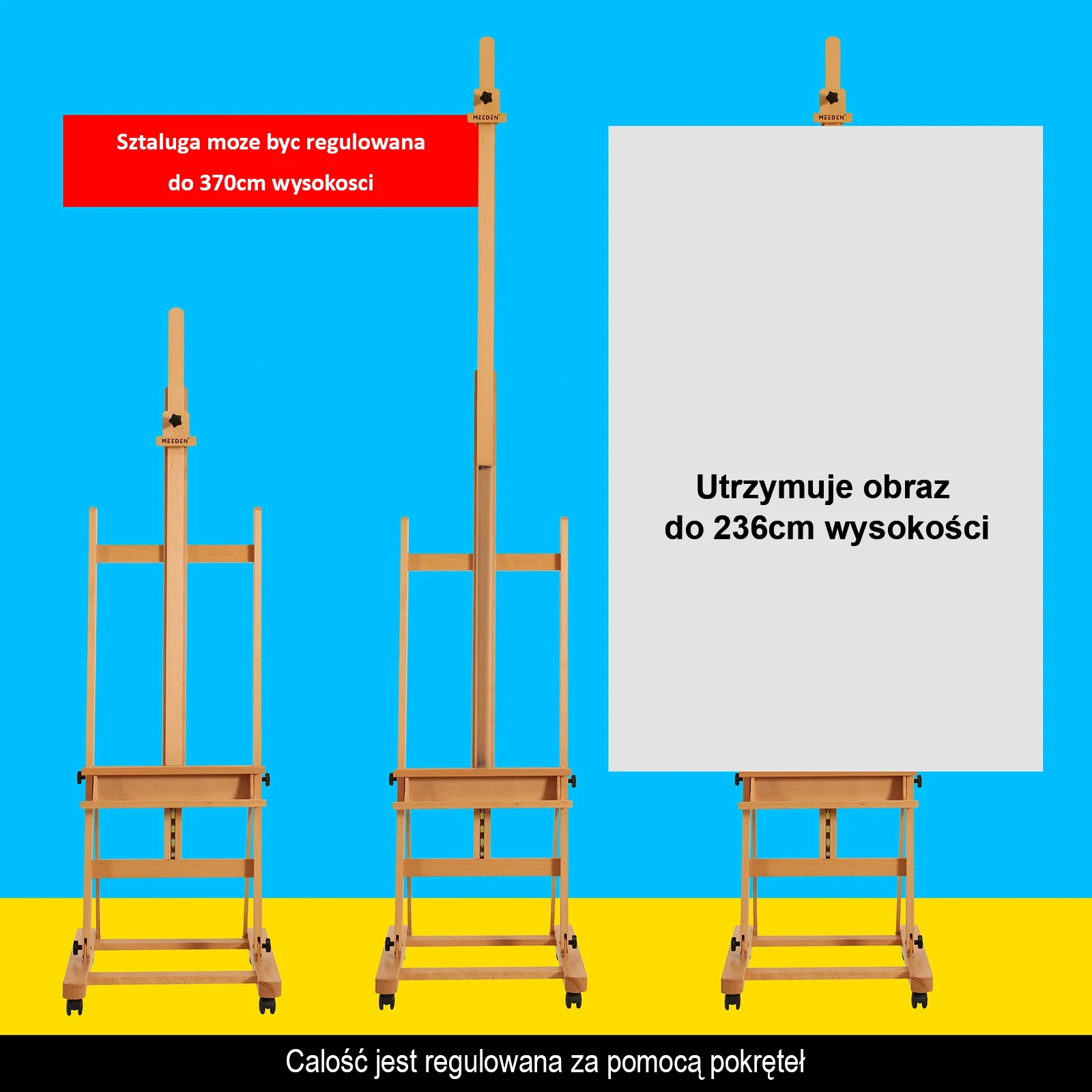 Meeden SZTALUGA STUDYJNA BUKOWA DUŻA Z KÓŁKAMI to solidny i funkcjonalny statyw do malowania w atrakcyjnej cenie. Jej całkowita wysokość jest regulowana w zakresie od 190 cm do 370 cm przy nachyleniu pionowym, umożliwiając pracę na płótnach o wysokości do 236 cm. Maksymalne obciążenie wynosi 30 kg.