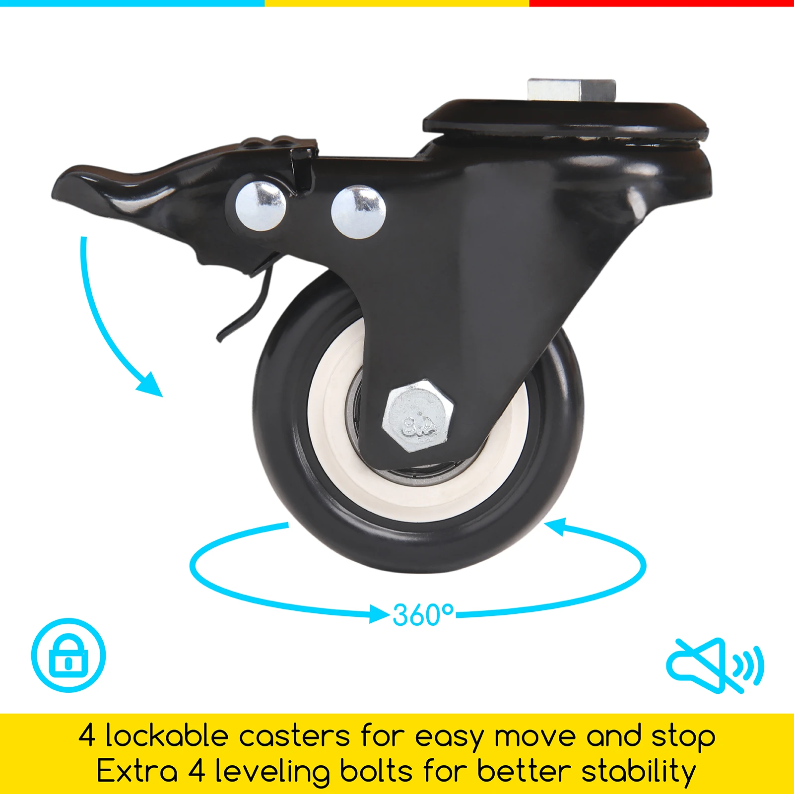 Model ten wyposażono również w funkcjonalną przestrzeń do przechowywania — dwie duże boczne szuflady oraz przednią tackę ułatwiają organizację materiałów i narzędzi. Mobilność zapewniają cztery ciche kółka obracające się o 360°, z czego dwa posiadają hamulce, gwarantujące stabilność podczas pracy.