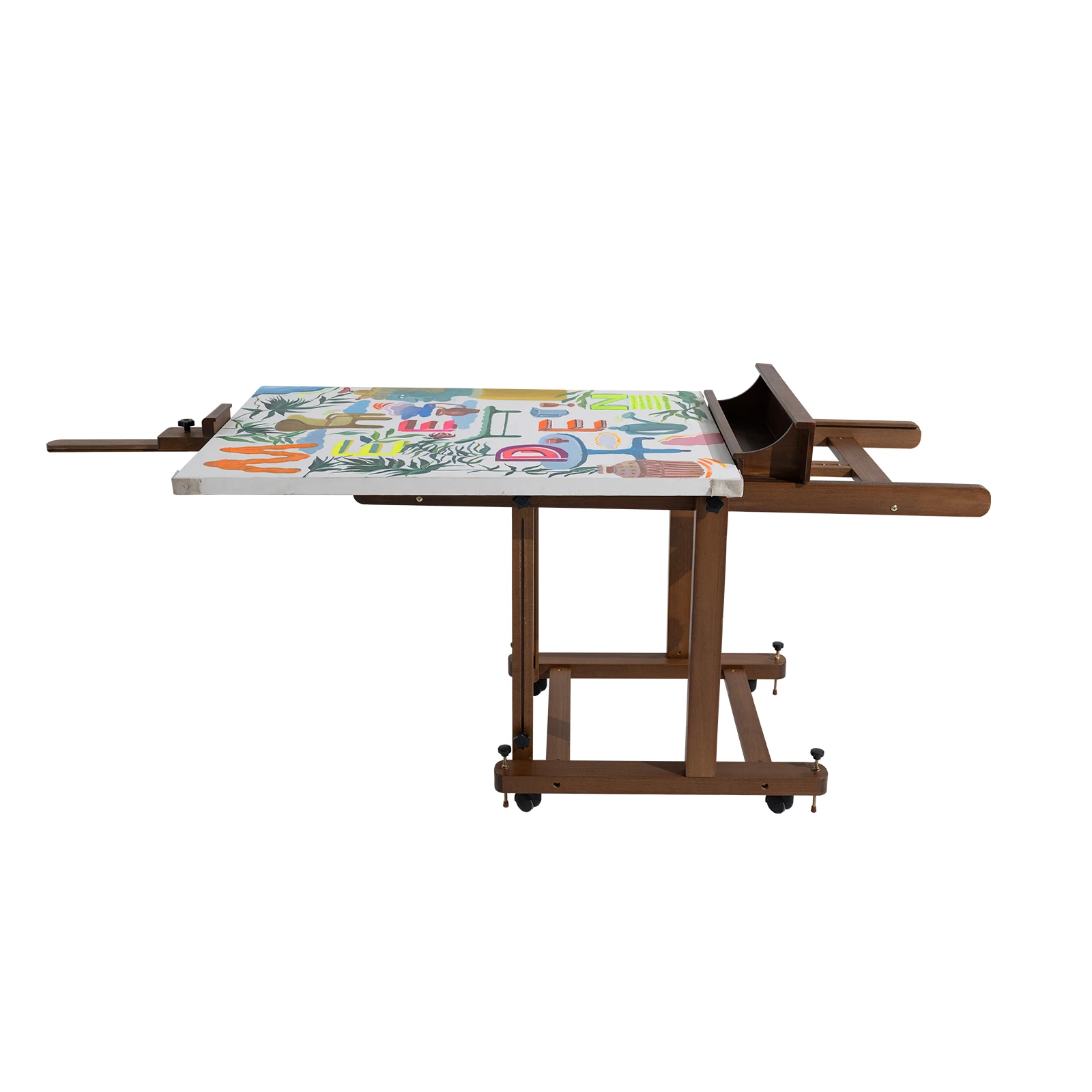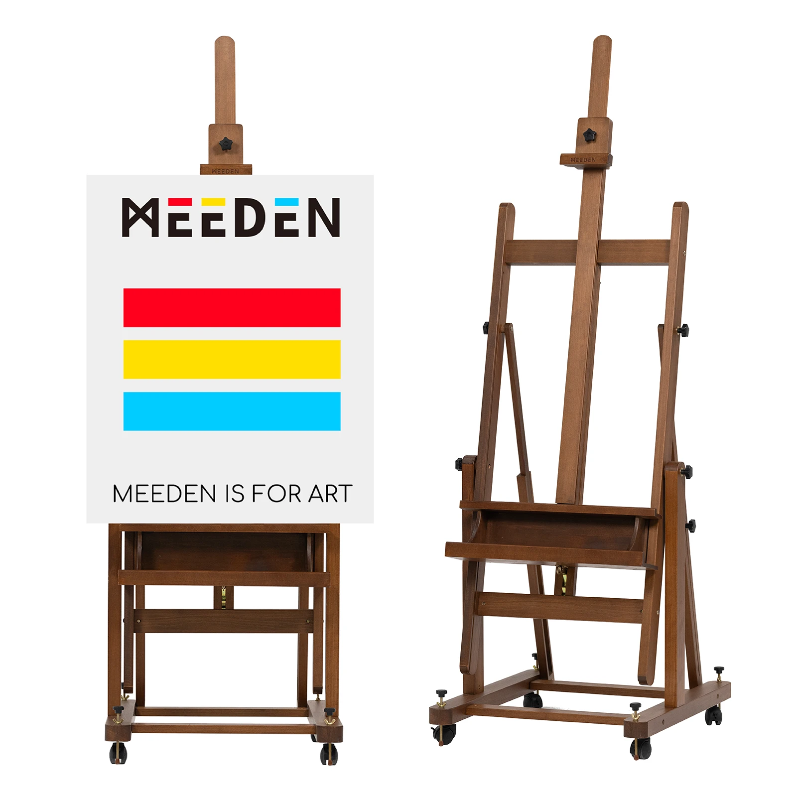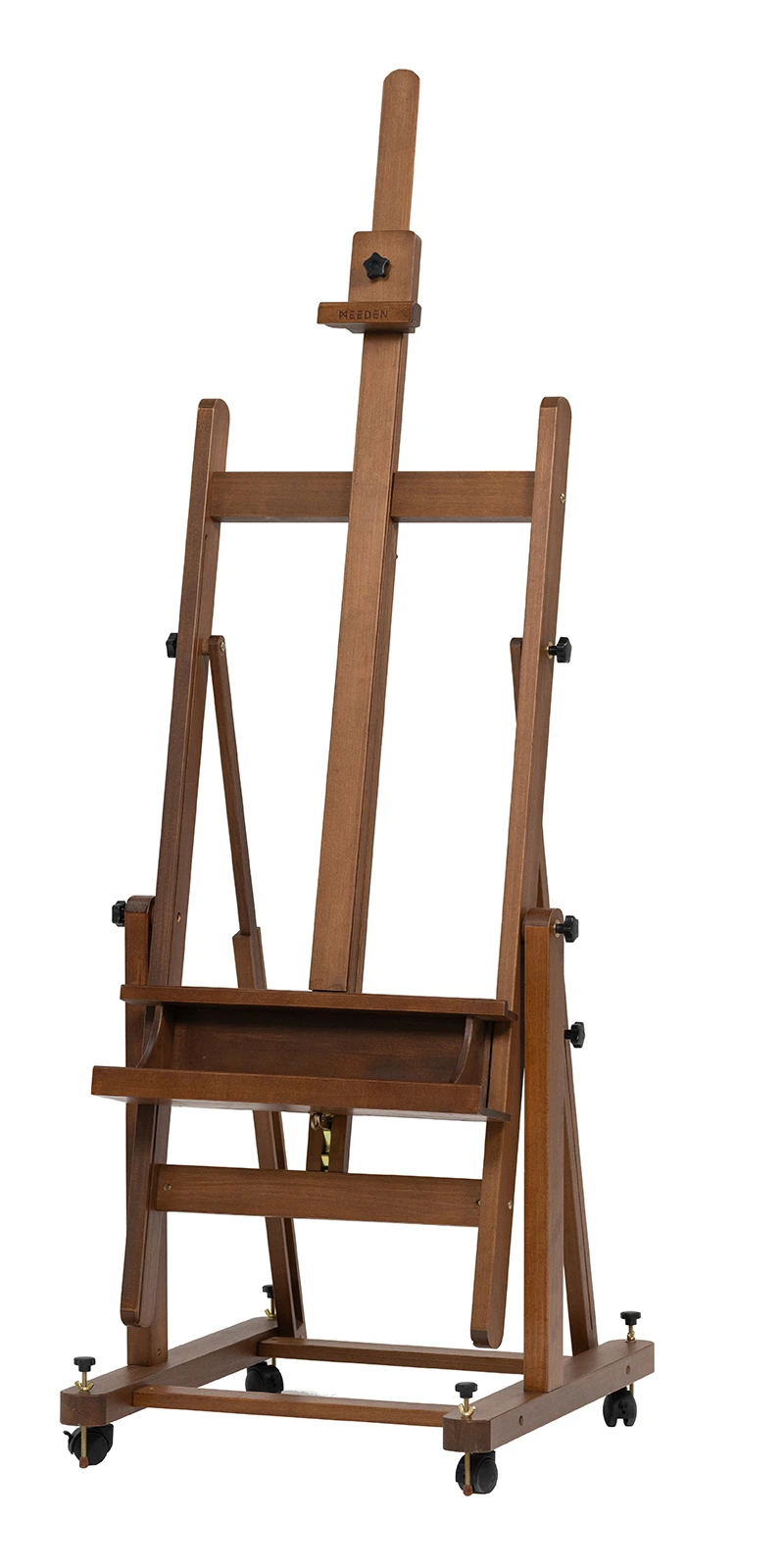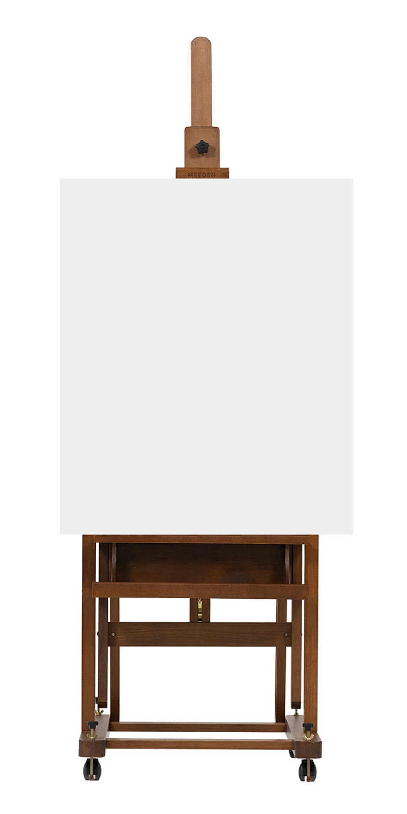 Meeden Sztaluga studyjna profesjonalna - pozioma - MAMUT ciemna to wysokiej jakości drewniana sztaluga została wykonana z europejskiego drewna bukowego, starannie wypolerowanego i wykończonego w ciemnym kolorze. Jej uniwersalny design doskonale komponuje się z każdym wnętrzem — od profesjonalnych pracowni i studiów artystycznych po prywatne galerie.