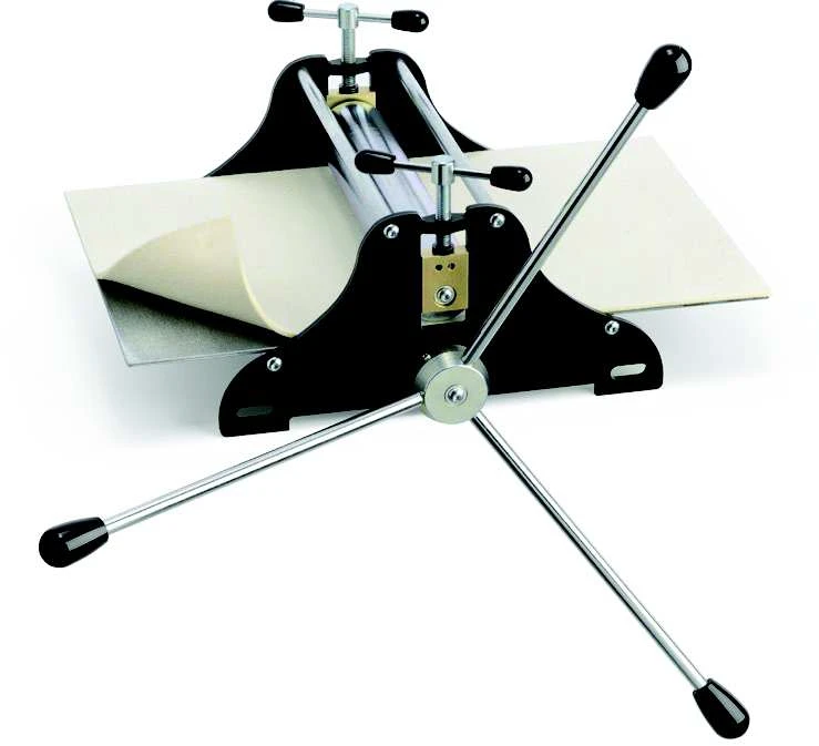 Nowa ręczna prasa do druku wklęsłego wykonana jest z solidnej stalowej konstrukcji, wyposażonej w wałki o średnicy 50 mm. System napędowy opiera się na trójramiennym kole o długości ramienia 28 cm, co zapewnia płynne i równomierne prowadzenie płyty podczas druku.