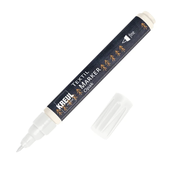 Marker tekstylny KREUL Opak fine jest precyzyjny na tkaninach. Stabilna wymiarowo końcówka rysuje smukłe linie i jest idealna do konturów, wstępnych rysunków lub filigranowych ozdób. Marker tekstylny nadaje się do cienkich i grubych tkanin. Czy to na jasnych, czy ciemnych tkaninach: biel lub czerń markerów tekstylnych KREUL Opak fine jest intensywna i mocno kryjąca.