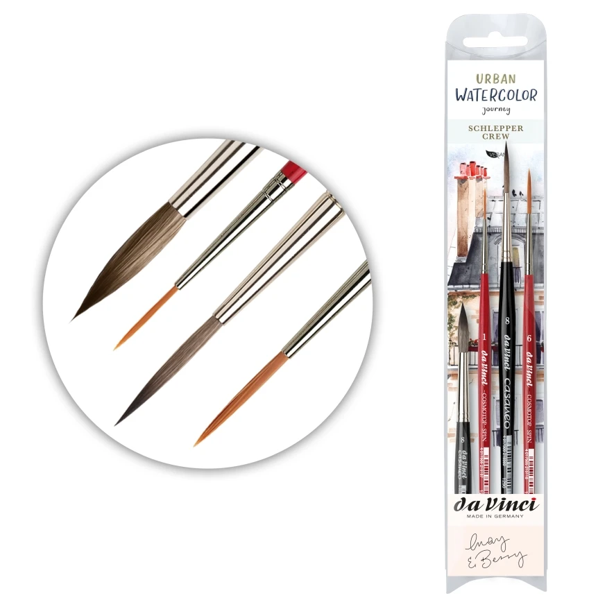 Zestaw czterech syntetycznych pędzli Da Vinci Urban Watercolor Rigger Crew powstał we współpracy z artystycznym duetem May & Berry. Obejmuje pędzle akwarelowe z długim, okrągłym włosiem z serii Cosmotop-spin oraz Casaneo, zaprojektowane z myślą o malarstwie pejzaży miejskich. Nadają się nie tylko do pracy na papierze, ale również na jedwabiu. Długość pędzli waha się od 15 do 20 cm.