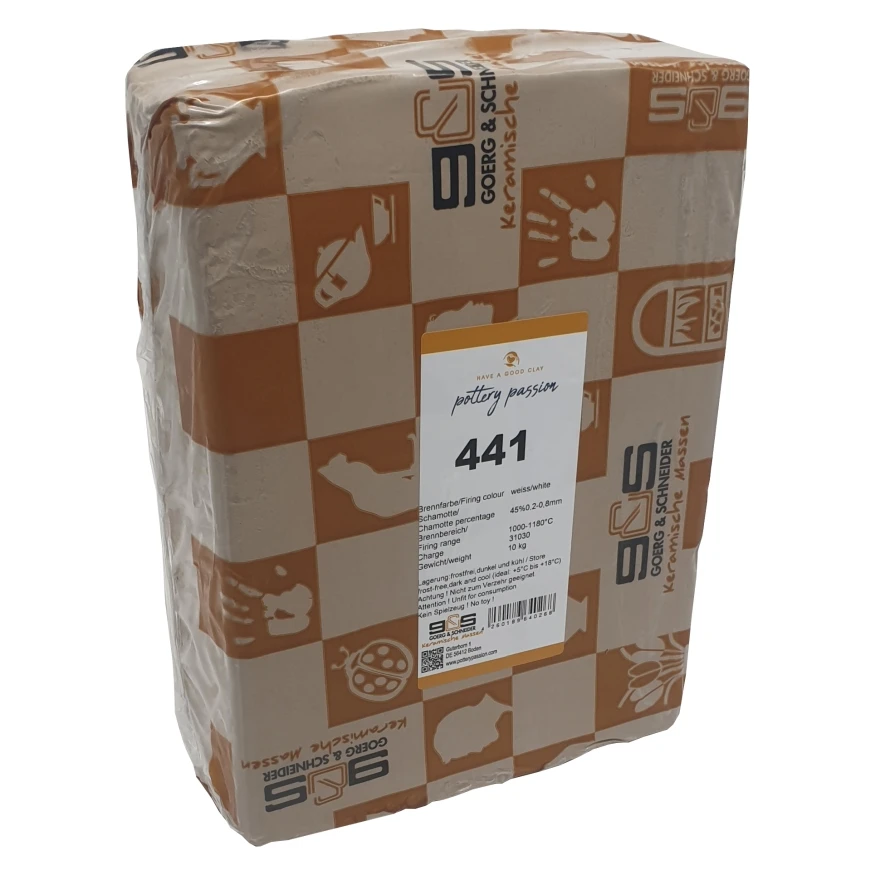 Goerg & Schneider G&S 441 to profesjonalna masa ceramiczna o wysokiej jakości, charakteryzująca się jasnym, białym kolorem po wypaleniu. Glina ta zawiera wysoką zawartość szamotu (ok. 40%) o granulacji 0,2-0,8 mm, co znacząco poprawia jej parametry techniczne – zapewnia wyjątkową stabilność formy podczas modelowania oraz minimalizuje ryzyko pęknięć w trakcie suszenia i wypalania. Specyficzna struktura masy sprawia, że jest ona niezwykle odporna na naprężenia oraz gwałtowne zmiany temperatury, pozostając jednocześnie materiałem o doskonałej plastyczności.
