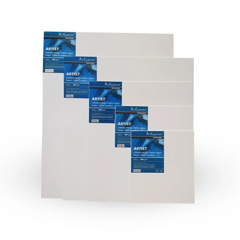 Panel malarski wykonany jest ze sprasowanego papieru o grubości ~4mm, na który przyklejone jest zagruntowane płótno malarskie.